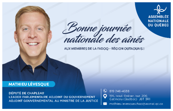 En tant que présidente de la FADOQ – Région Outaouais, je souhaite, au nom du CA et de notre équipe, vous exprimer toute mon admiration et ma profonde reconnaissance pour votre engagement, la richesse de vos savoirs transmis et l’héritage précieux que vous laissez à nos communautés. En cette Journée nationale des aînés, nous soulignons l’apport inestimable des aînés à notre société et leur rôle essentiel dans le dynamisme de nos milieux de vie.