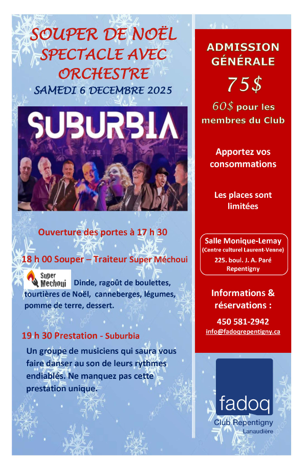 Notre Club a l'immense plaisir de vous convier à une soirée des plus spéciales. Le tout débutera par un excellent repas (apportez votre vin), suivi du spectacle de Suburbia, groupe de huit musiciens et chanteurs.