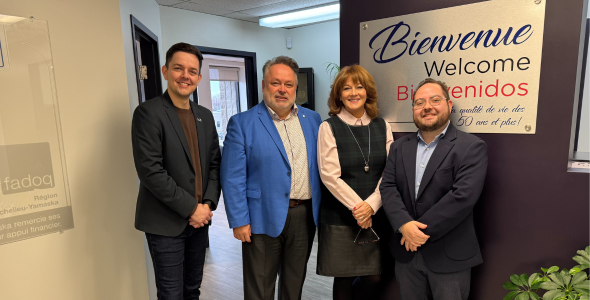 Jeudi 27 novembre, au 2685 boulevard Casavant Ouest, bureau 265, la FADOQ – Région Richelieu-Yamaska a eu le plaisir d’accueillir des représentants de Saint-Hyacinthe Technopole et le Maire de la Ville de Saint-Hyacinthe, M. André Beauregard. Cette rencontre avait pour objectif de souligner notre récent déménagement, une étape stratégique qui accompagnera la croissance de nos activités et le déploiement de nos services.