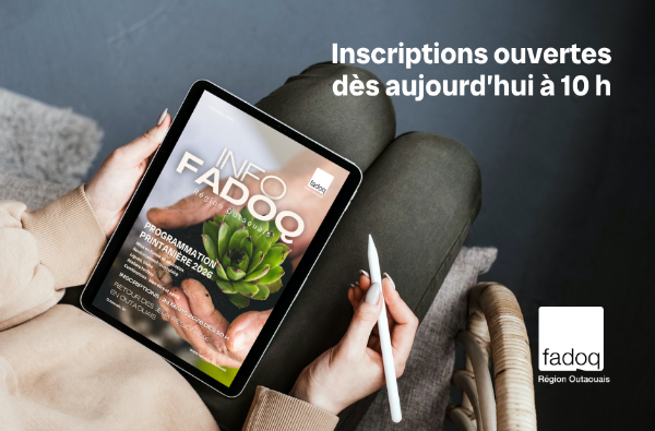 Soyez prêts car pour la première fois, la FADOQ Outaouais ouvrira les inscriptions à sa programmation de printemps à 10 h ce matin. Assurez-vous d’avoir votre carte de membre FADOQ valide pour vous inscrire à nos activités.