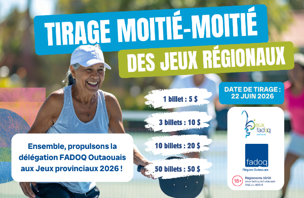 Derrière chaque billet acheté, il y a un geste de fierté. La FADOQ Outaouais lance sa toute première collecte de fonds moitié-moitié en ligne, afin de soutenir les membres de sa délégation qui représenteront la région aux Jeux provinciaux 2026 à Saint-Hyacinthe.