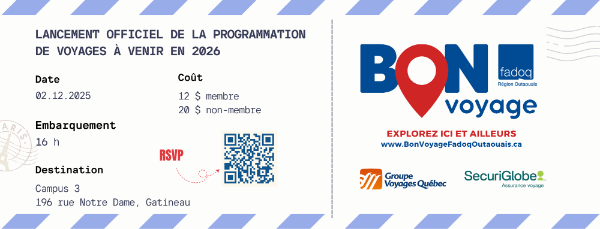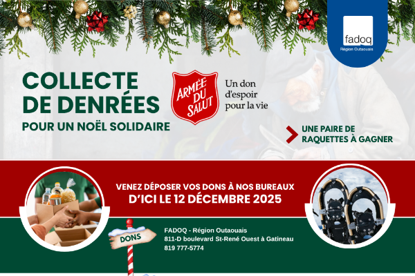 La FADOQ – Région Outaouais est fière de lancer la 4ᵉ édition de sa collecte de denrées non périssables au profit de l’Armée du Salut de Gatineau. Cette initiative solidaire vise à offrir un peu de réconfort aux personnes dans le besoin durant la période des Fêtes.