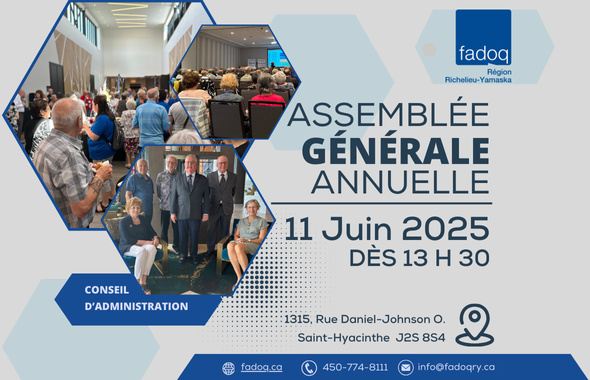 La prochaine Assemblée générale annuelle de la Fadoq Richelieu-Yamaska se tiendra au Centre de congrès de Saint-Hyacinthe le 11 juin 2025.