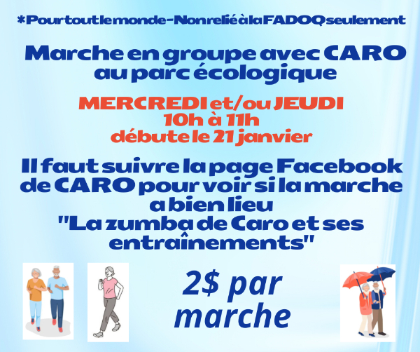 Marche de groupe avec Caroline Caouette notre professeur de Bouger+. Pour tout le monde (pas juste relié à la FADOQ). Tous les mercredi et jeudi de 10h à 11h au parc écologique. Il faut suivre sa page Facebook pour voir si la marche a bien lieu. (Page Facebook "La zumba de Caro et ses entraînements").