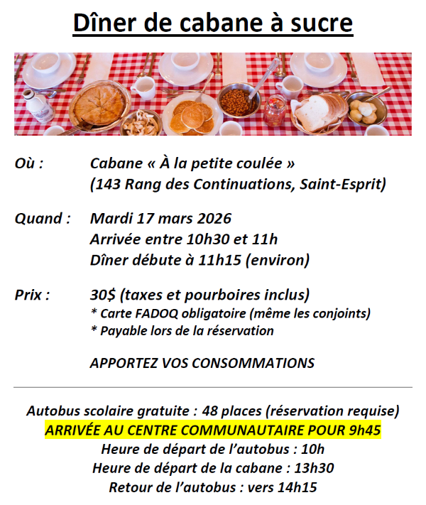 Voici les détails de notre sortie organisée par la FADOQ L'Assomption à la cabane à sucre ainsi que quelques suggestions organisées par des partenaires (non sous la responsabilité de la FADOQ).