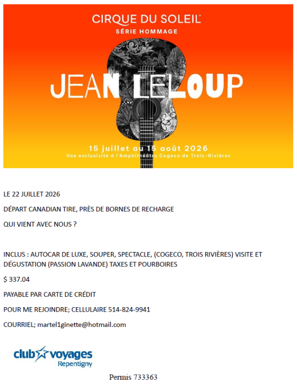Plusieurs nous demandent des sorties/voyages de groupe. Puisque c'est maintenant très difficile de remplir un autobus juste pour L'Assomption, nous vous suggérons GINETTE MARTEL de CLUB VOYAGES REPENTIGNY. Elle propose des sorties/voyages au départ de Repentigny. C'est donc une belle option que l'on vous suggère, pas loin, et d'être en groupe parmis des gens de votre région. Voyez son groupe (web) ci-dessous et aussi demandez à être dans sa liste d'envoi pour être toujours à l'affut des primeurs et autres suggestions tout au long de l'année !