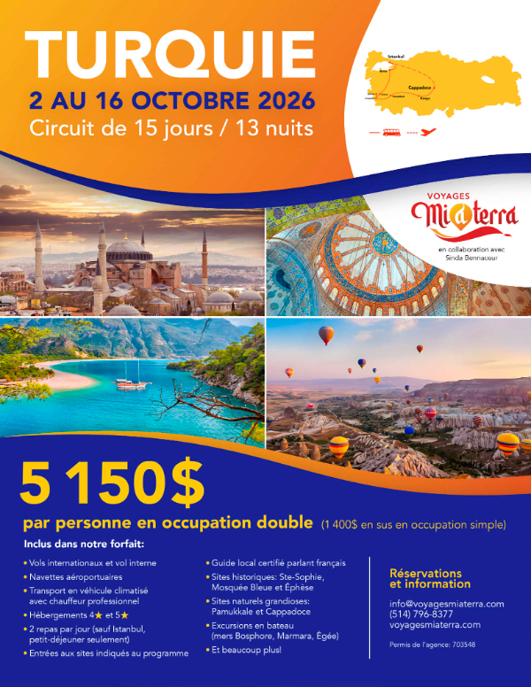 Voyage de groupe en Turquie accompagné par Sinda Bennaceur notre professeur de Zumba. Pour tout le monde (pas juste relié à la FADOQ). Ce voyage sera unique à Sinda avec des propositions unique à ce voyage.